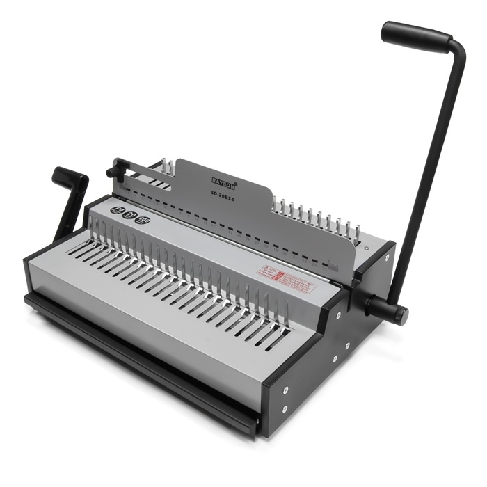 Две рукоятки позволяют одновременно выполнять перфорацию и брошюровку, повышая эффективность. Механизм раскрытия пружины размещен спереди и снизу для удобства при работе с объемными материалами. Металлический корпус гарантирует надежность и долговечность, делая SD-20B24 мощным инструментом для профессионального использования.