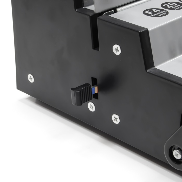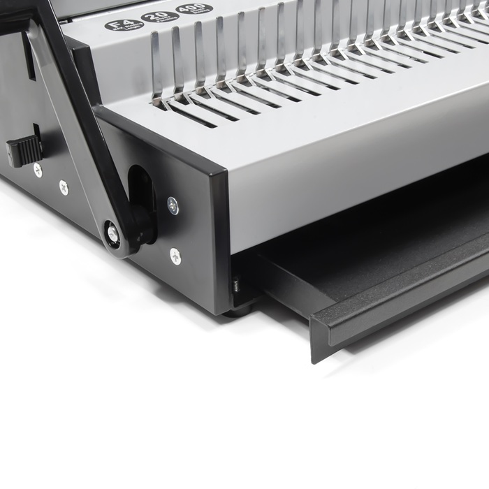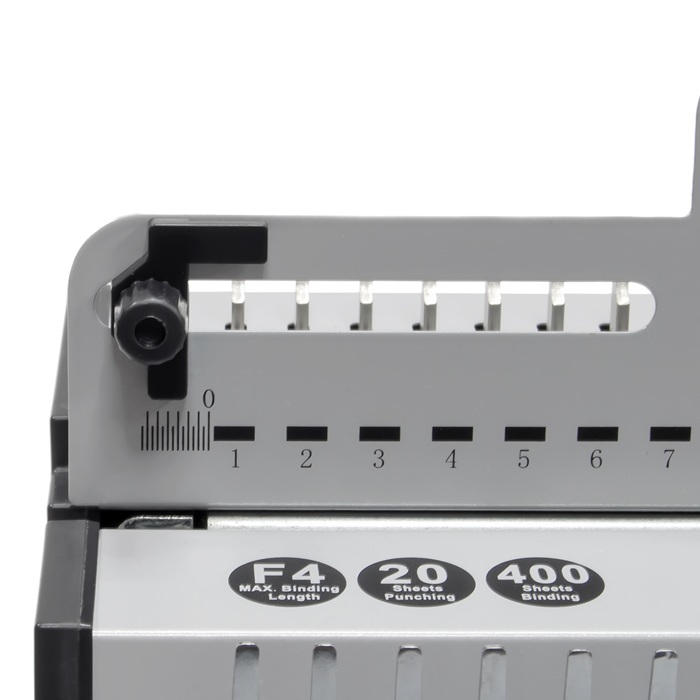 Преимущества включают возможность отключения всех пуансонов для обработки нестандартных форматов, таких как дизайнерская бумага, а также неограниченную длину переплета. Устройство поддерживает перфорацию различных размеров: А3 и В4 с 24 отверстиями, А4 с 21 и А5 с 14. Регулировка глубины отступа от края листа до отверстий доступна в трех режимах (5, 6 или 9 мм), что адаптируется под диаметр пружины для оптимальной прочности.