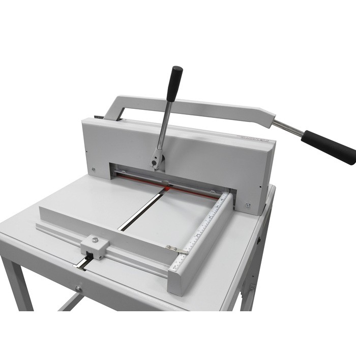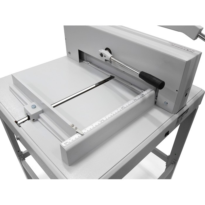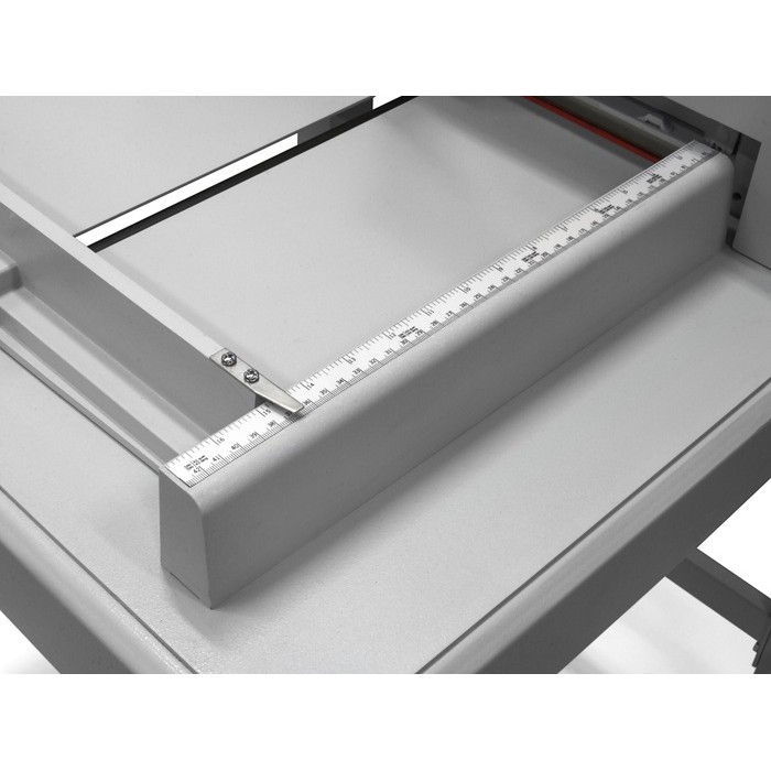 - Размер рабочего стола: 680 × 680 мм, выполнен из прочного металла, что обеспечивает стабильность и устойчивость к износу. - Дополнительные особенности: - Разметка линейки на неподвижном упоре для удобства. - Рукоятка прижима для быстрой фиксации бумаги.