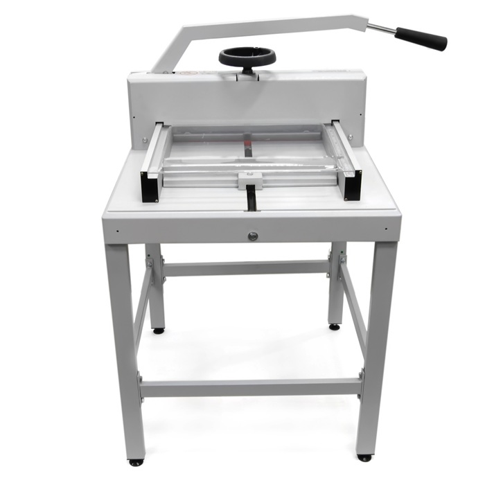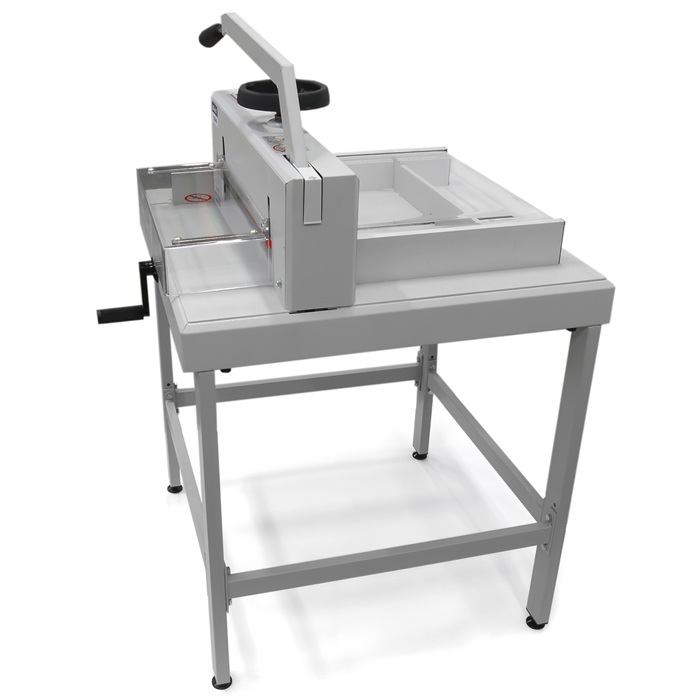 Для максимальной точности реза предусмотрена удобная рукоятка перемещения заднего упора (затла), расположенная на передней панели. С ее помощью можно настроить позицию с точностью до 0,5 мм, что критично для создания визиток, этикеток или других мелкоформатных изделий. Эргономичный дизайн упрощает процесс, снижая утомляемость оператора и повышая производительность. В комплекте с резаком поставляется все необходимое: отдельная сборно-разборная подставка-стол, которая обеспечивает устойчивость и удобную высоту работы; марзан для защиты ножа от затупления; а также сам нож, изготовленный из закаленной стали высокой твердости, гарантирующей долгий срок службы без частой замены.