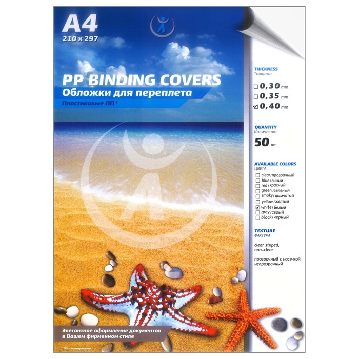 Обложка для переплета пластиковая непрозрачная используется при брошюровке документов чаще всего как нижняя обложка. Пластиковая обложка для переплета хорошо защищает страницы от пыли и грязи, придает документу более строгий и презентабельный вид. Эта обложка непрозрачная, белая, поэтому через нее не видно текст, напечатанный на листе бумаги, на котором лежит обложка. Поверхность обложки матовая, слегка шероховатая. Толщина обложки 0,40мм. Формат А4. В одной упаковке 50 штук обложек. Материал обложки ПП (полипропилен) - это дорогой материал, поэтому обложка приятная на ощупь и придает документу солидность. Подходит ко всем типам брошюраторов и переплетных машин