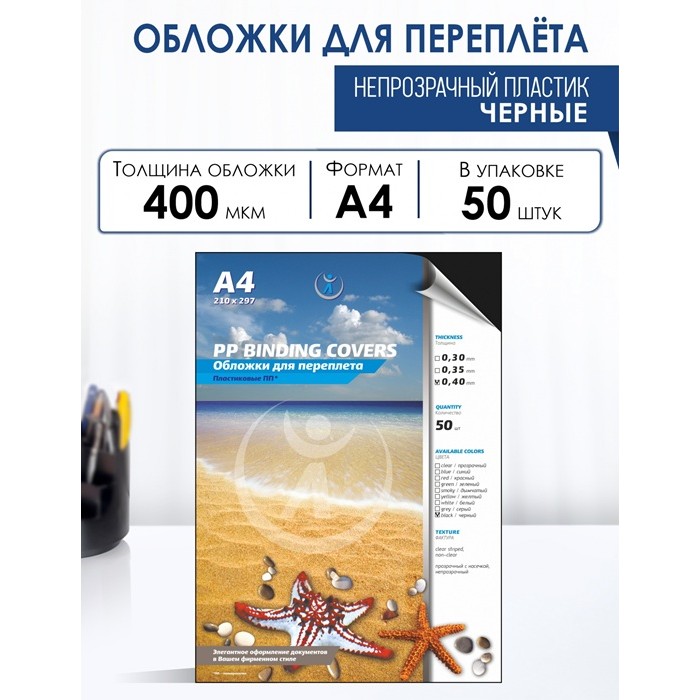 Обложка для переплета пластиковая непрозрачная используется при брошюровке документов чаще всего как нижняя обложка. Пластиковая обложка для переплета хорошо защищает страницы от пыли и грязи, придает документу более строгий и презентабельный вид. Эта обложка непрозрачная, черная, поэтому через нее не видно текст, напечатанный на листе бумаги, на котором лежит обложка. Поверхность обложки матовая, слегка шероховатая. Толщина обложки 0,40мм. Формат А4. В одной упаковке 50 штук обложек. Материал обложки ПП (полипропилен) - это дорогой материал, поэтому обложка приятная на ощупь и придает документу солидность. Подходит ко всем типам брошюраторов и переплетных машин