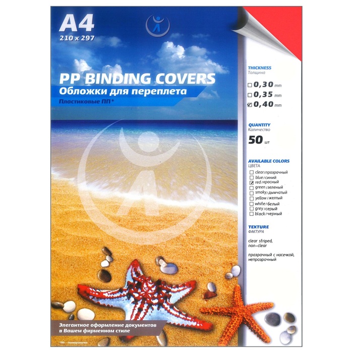 Обложка для переплета пластиковая непрозрачная используется при брошюровке документов чаще всего как нижняя обложка. Пластиковая обложка для переплета хорошо защищает страницы от пыли и грязи, придает документу более строгий и презентабельный вид. Эта обложка непрозрачная, красная, поэтому через нее не видно текст, напечатанный на листе бумаги, на котором лежит обложка. Поверхность обложки матовая, слегка шероховатая. Толщина обложки 0,40мм. Формат А4. В одной упаковке 50 штук обложек. Материал обложки ПП (полипропилен) - это дорогой материал, поэтому обложка приятная на ощупь и придает документу солидность. Подходит ко всем типам брошюраторов и переплетных машин