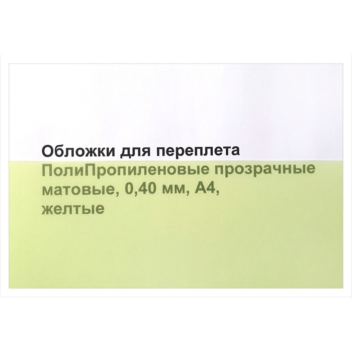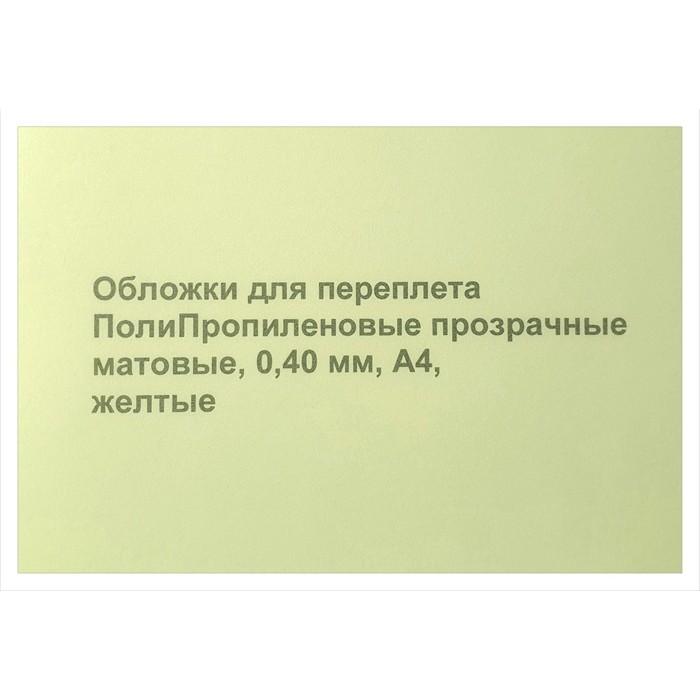 Обложка для переплета пластиковая прозрачная используется при брошюровке документов чаще всего как верхняя обложка. Пластиковая обложка для переплета хорошо защищает страницы от пыли и грязи, придает документу более строгий и презентабельный вид. Эта обложка прозрачная, желтая, матовая, поэтому через нее виден текст, напечатанный на листе бумаги, на котором лежит обложка. Поверхность обложки матовая, слегка шероховатая. Толщина обложки 0,40мм. Формат А4. В одной упаковке 50 штук обложек. Материал обложки ПП (полипропилен) - это дорогой материал, поэтому обложка приятная на ощупь и придает документу солидность. Подходит ко всем типам брошюраторов и переплетных машин.