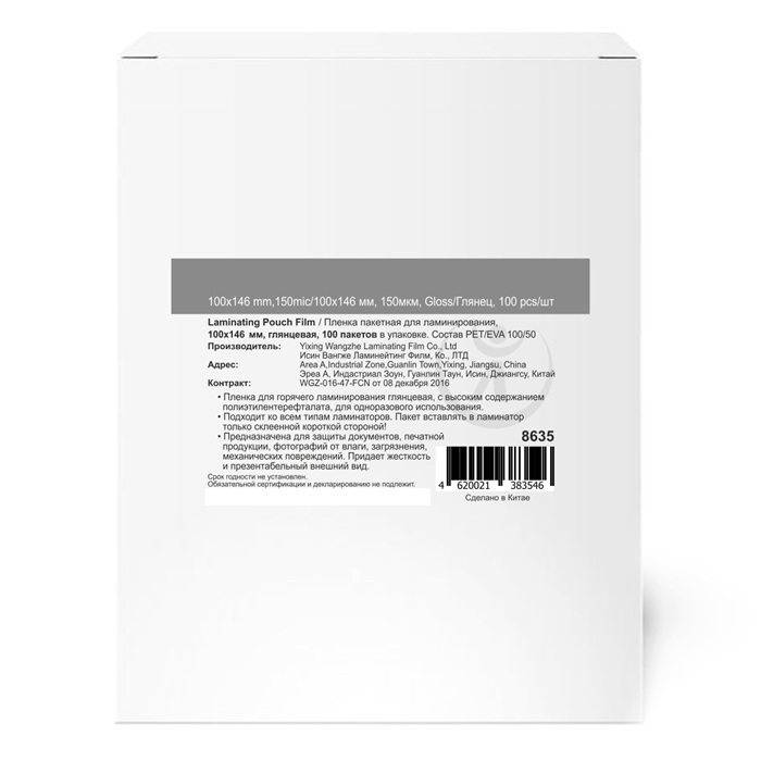 Глянцевая пакетная пленка для горячего ламинирования с высоким содержанием полиэтилентерефталата (PET). Размер 100х146 мм, толщина 150 мкм. В пачке 100 ламинационных пакетов. Каждый пакет состоит из двух пленок, склеенных по короткой стороне. Толщина одной пленки - 150 мкм, общая толщина заламинированного пакета - 300 мкм (150+150) плюс толщина ламинируемой бумаги. РЕТ/LDPE/EVA - 100/0/50 мкм. Пленка предназначена для защиты документов, фотографий, меню, визиток, пропусков, ценников, обучающих и игровых карточек, печатной продукции от влаги, грязи и механических повреждений. Придает изделиям жесткость и эстетичный вид. Совместима со всеми типами ламинаторов. Для использования поместите документ в ламинационный пакет и вставьте его в ламинатор склеенной стороной вперед. Пленка для ламинирования сохранит ваши документы, воспоминания и важную информацию! Только для одноразового применения.