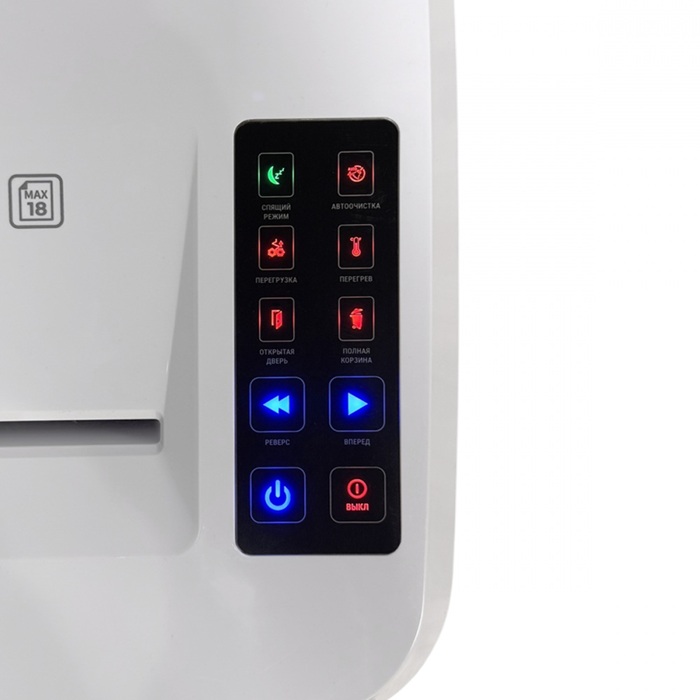 - Система индикации и защиты: Шредер оснащен полным набором индикаторов для мониторинга состояния: - Индикатор включения — показывает, что устройство готово к работе.
