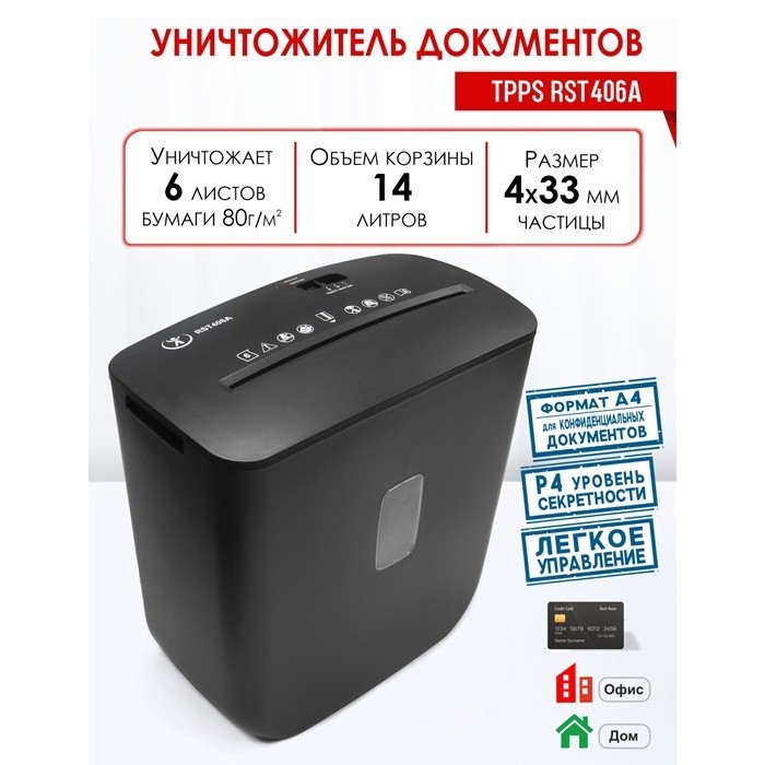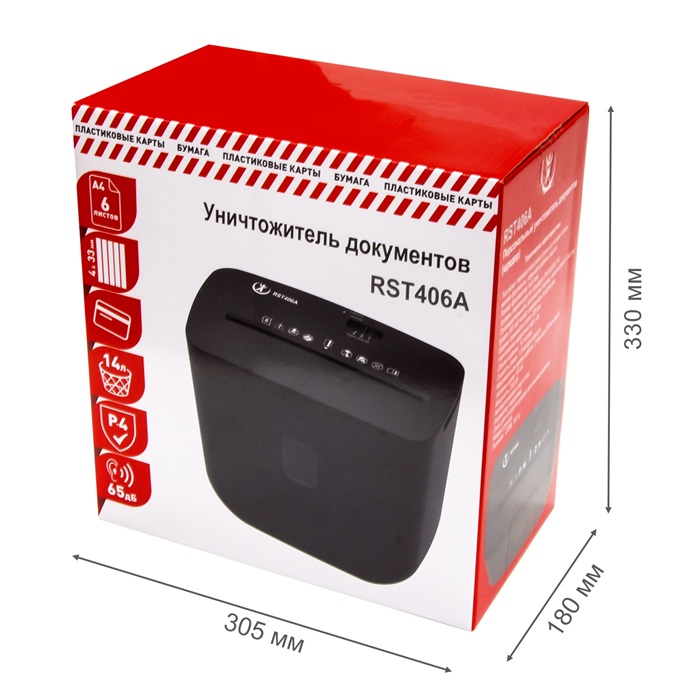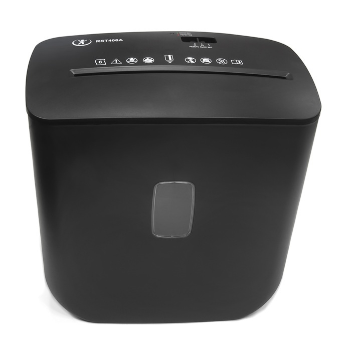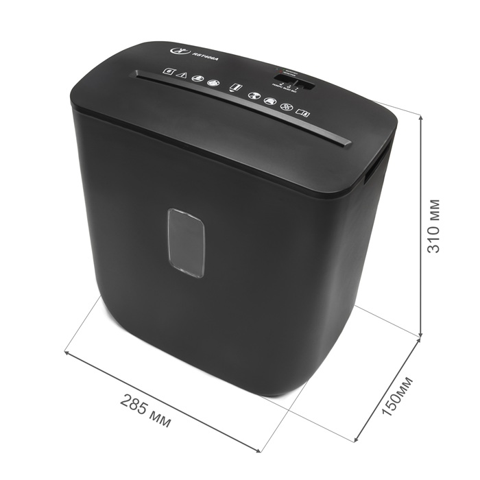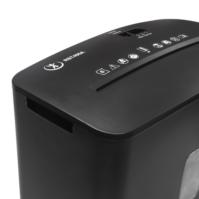 RST406A представляет собой мощный, простой и удобный в эксплуатации персональный уничтожитель документов, идеально подходящий для дома и малых офисов. Устройство обеспечивает надежную защиту конфиденциальной информации, измельчая бумагу и кредитные карты в частицы размером 4x33 мм, что соответствует степени секретности P4 по стандарту DIN 66399, предназначенной для обработки очень уязвимых данных, включая персональные сведения. Кроме того, модель эффективно справляется со степлерными скобами, повышая универсальность применения.